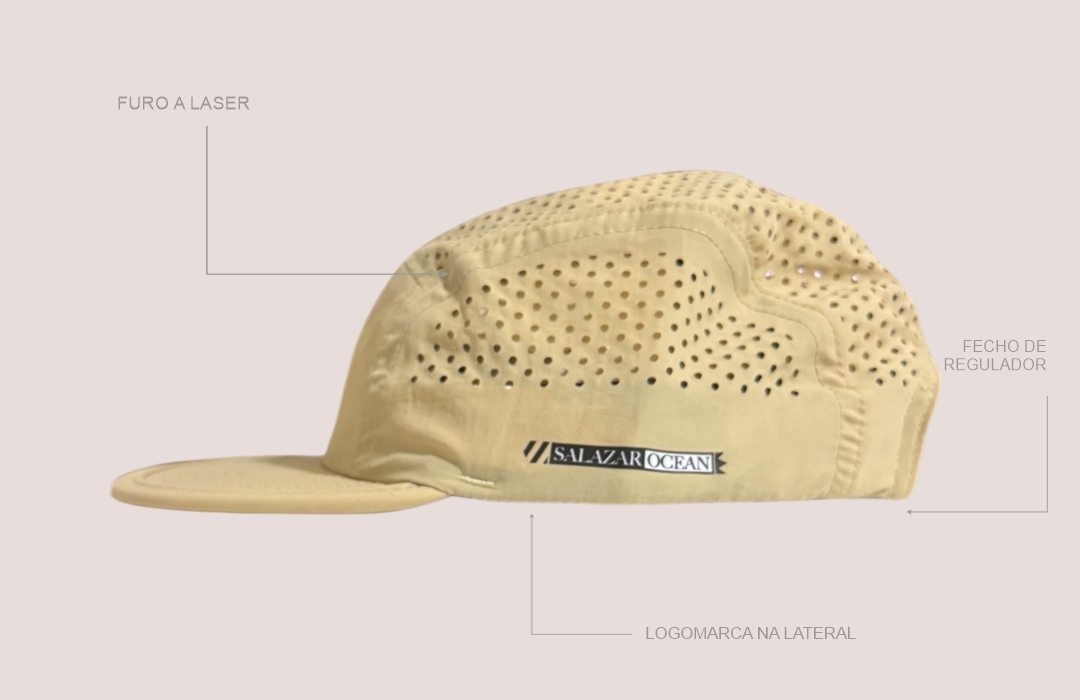 O Salazar Ocean é um boné five panel, confeccionado em 100% poliamida, pensado para quem vive em movimento entre o urbano e o mar.