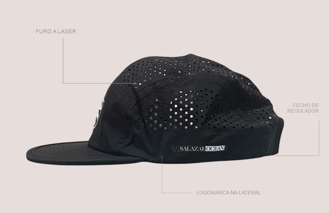 O Salazar Ocean é um boné five panel, confeccionado em 100% poliamida, pensado para quem vive em movimento entre o urbano e o mar.